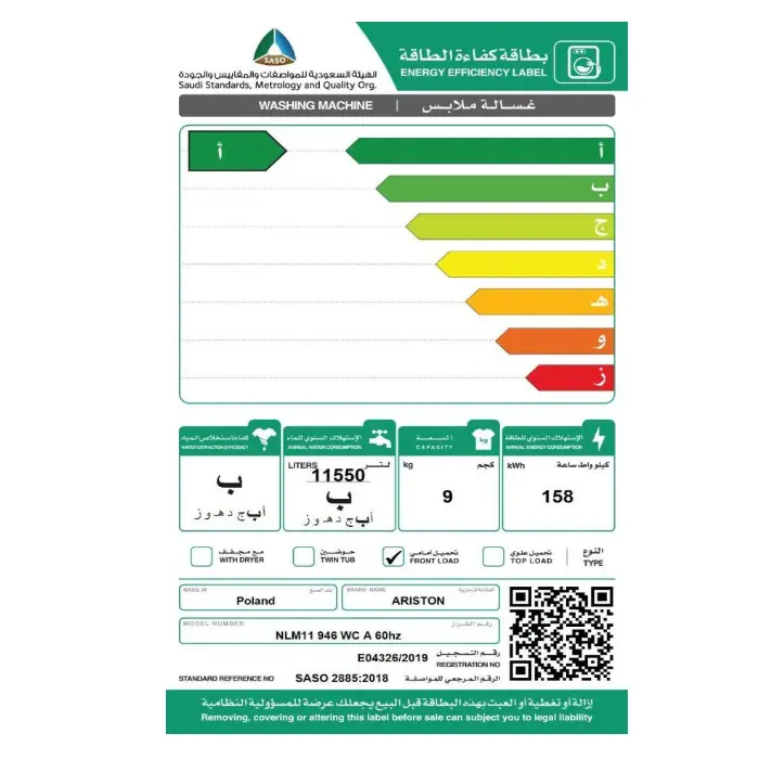 اريستون غسالة اتوماتيك 9 كيلو – انفرتر – أبيض NLM11946WCA60HZ