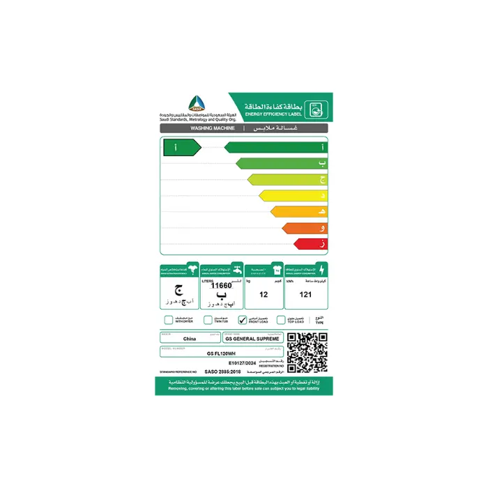 جنرال سوبريم غسالة فتحة امامية 12 كيلو انفرتر – 14 برنامج – فضي GSFL120WH