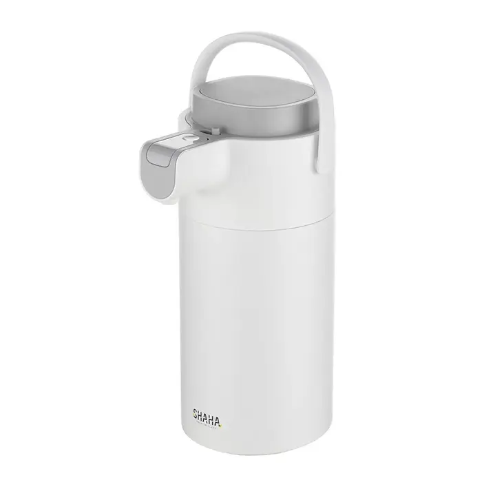 يجمع شاها ترمس ضغط بين مظهر أنيق راقٍ بلمسة المات الأبيض وبين متانة عالية تناسب الاستخدام المتكرر. زر الضغط العلوي يعمل بسلاسة تامة، مما يجعل صب المشروبات أسهل بدون أي انسكاب. كما أن المقبض المريح يسهّل حمله في أي مكان. التصميم الخارجي مقاوم للخدش ويحتفظ بجماله مع الوقت، مما يجعله اختيارًا مثاليًا في البيت، المكتب أو المناسبات.